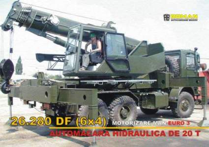 Roman 26.280 DF (Automacara hidraulica de 20 tone) echipat cu motor MAN D 0836 LF 03 (diesel, 6 cilindrii in linie, 6870 cmc, 280 CP, EURO 3), cutie de viteze tip EATON FS 8309 A (mecanica, cu 9+1 trepte de viteză), tractiune 6X4 si sarcina utila de 26000 kg.
