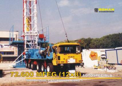 Roman 72.600 MFEG (Autospeciala echipata cu utilaj TD 125 pentru interventie la sonde) echipat cu motor CATERPILLAR 3306 BDITA (diesel, 6 cilindrii in linie, 10500 cmc, 300 CP, EURO 1), cutie de viteze tip ALLISON CLBT 754 (automata, cu 5+1 trepte de viteză), tractiune 12X8 si sarcina utila de 72000 kg.
